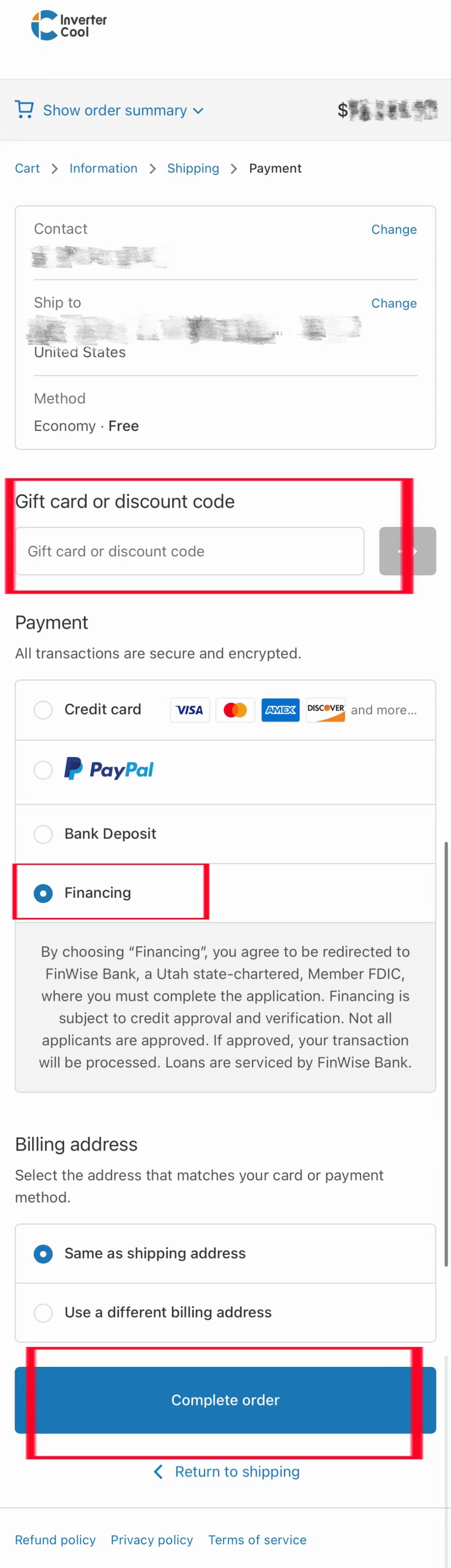 2. Go to “Payment” and select “Financing”. Don’t forget to fill up the Gift Card and Promotion Code if you have one. Then click “Complete order”.
